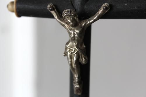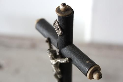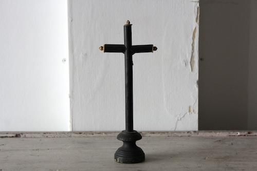 シンプルな丸木の黒い十字架に、素材感の異なる金属製のオブジェを飾りつけた小さいながらも存在感がのある一品です