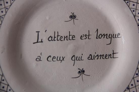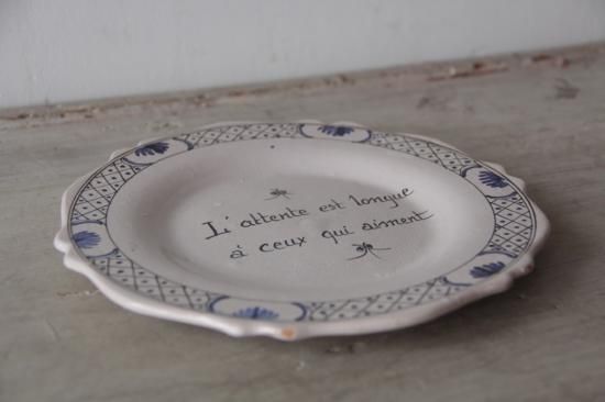 仏語の文章とイラストが手描きで描かれた陶器の絵皿