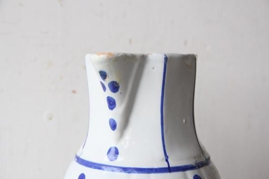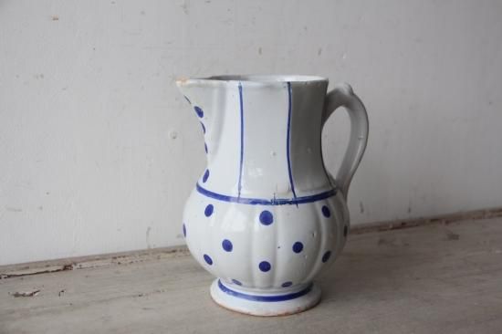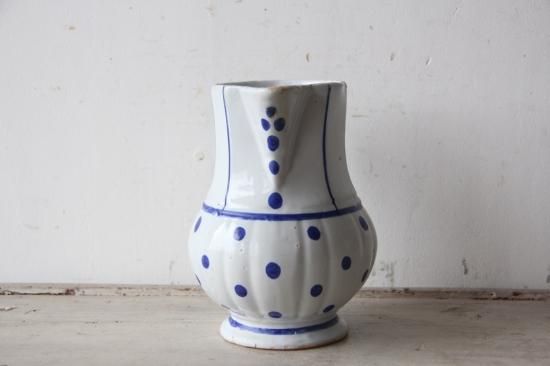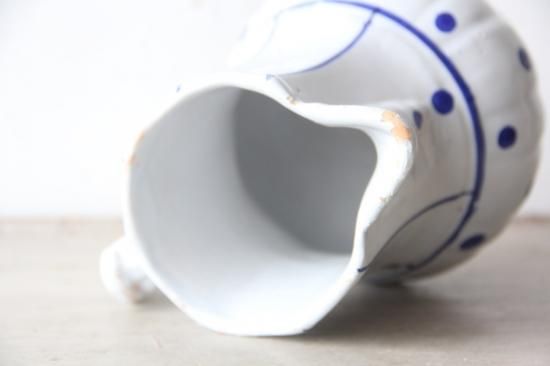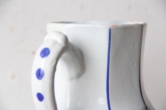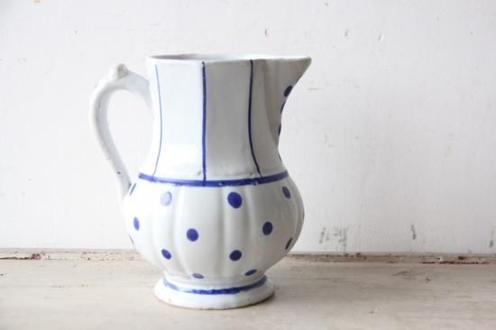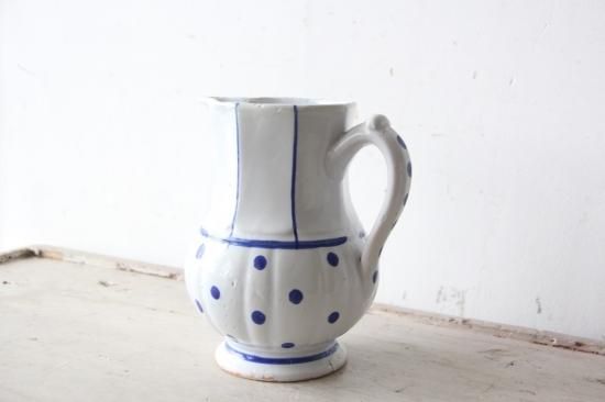 手描きの青いラインと水玉模様がとてもかわいらしい水差しです
