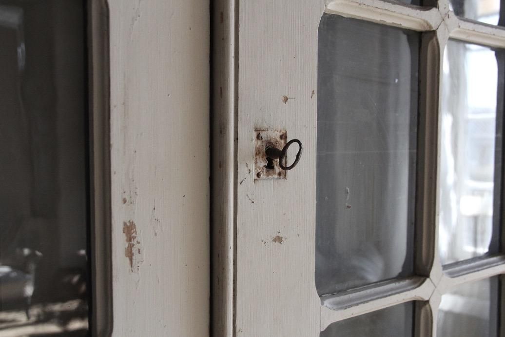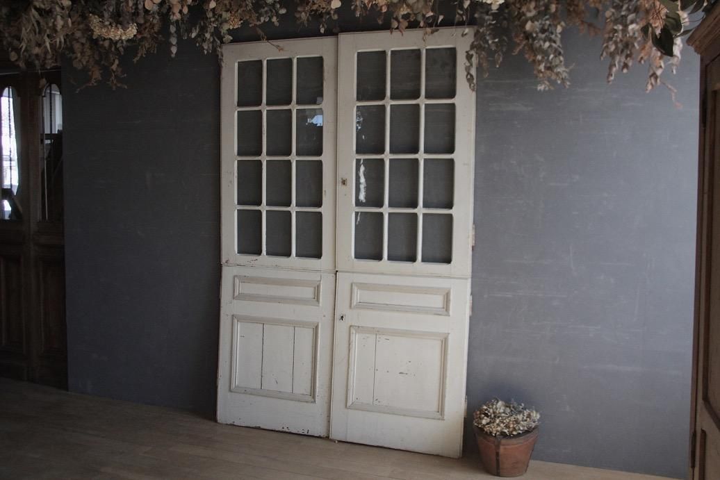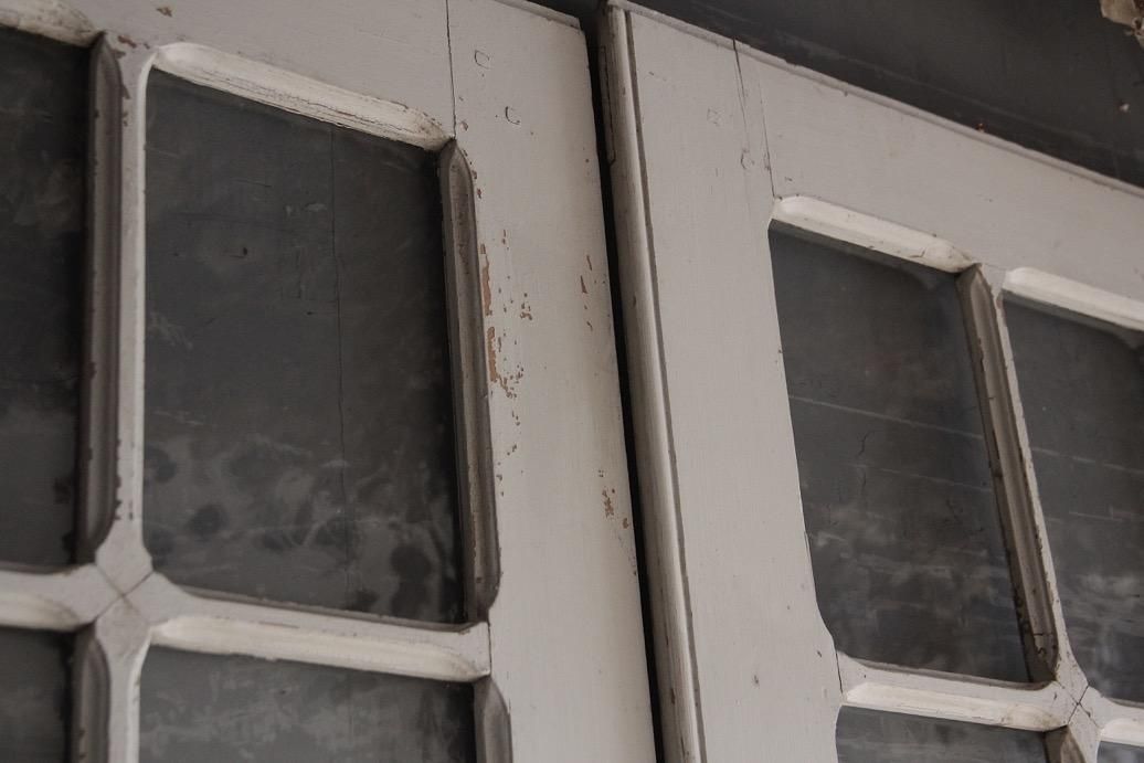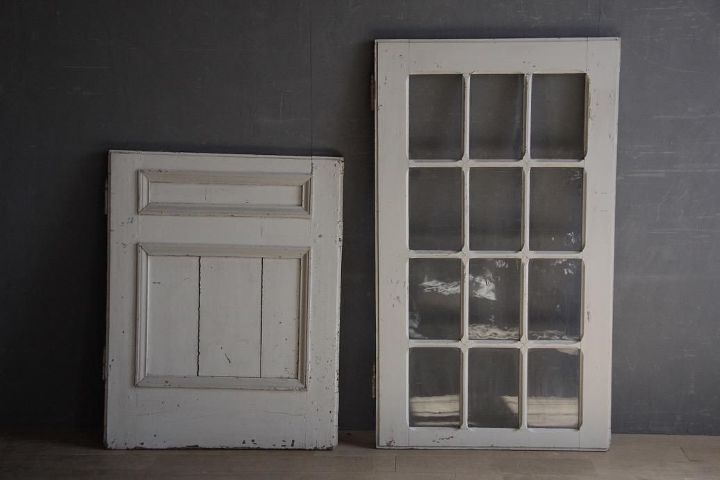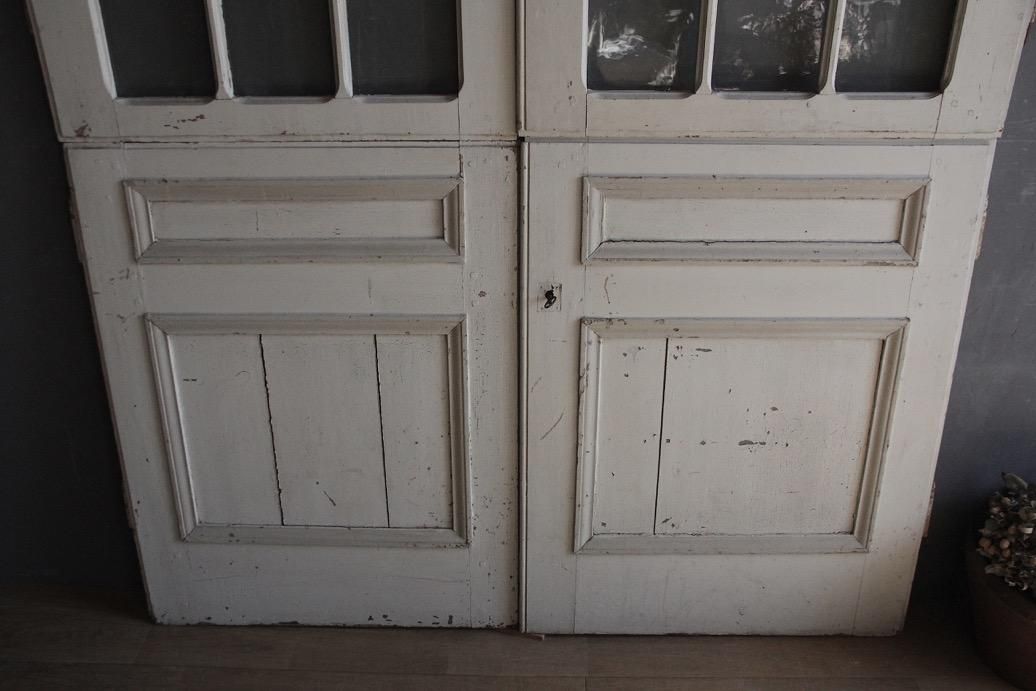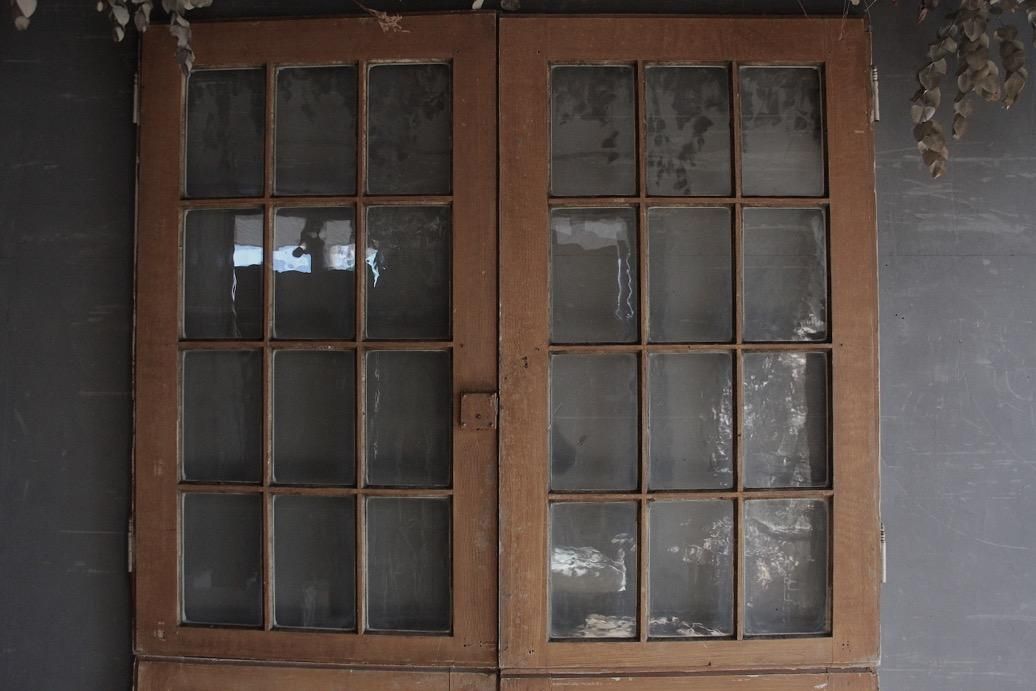 大型の本棚の扉として使われていたお品。上下で別に開閉できるのが特徴的で珍しい仕様