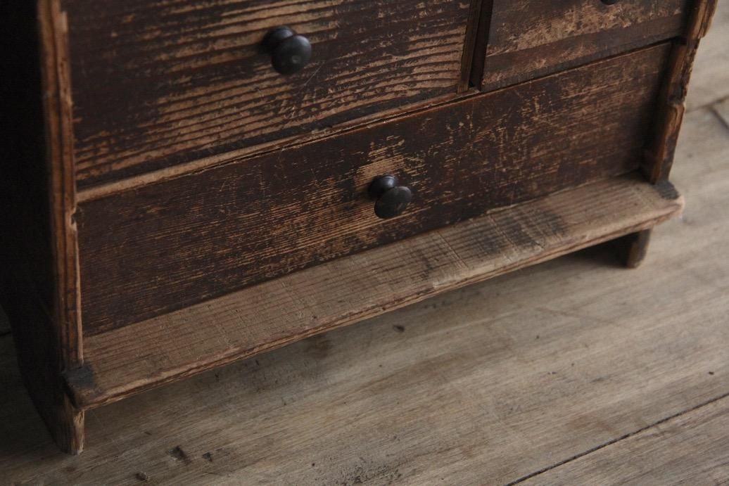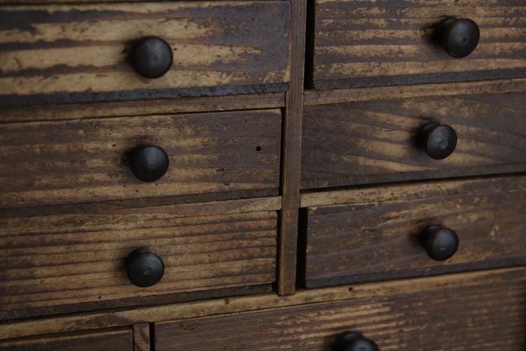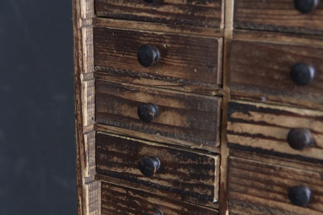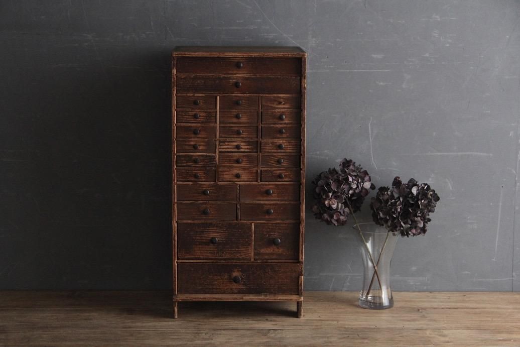 沢山並んだ27杯の引き出しが愛らしいお品。年月を経た木の表情も味わい深く雰囲気があります。