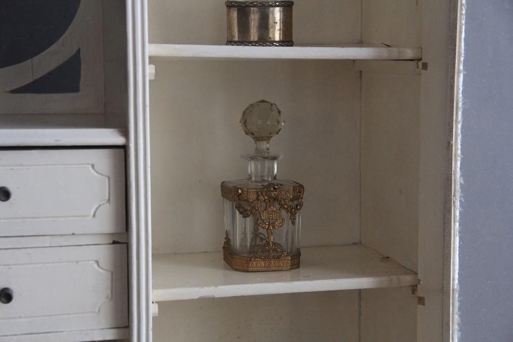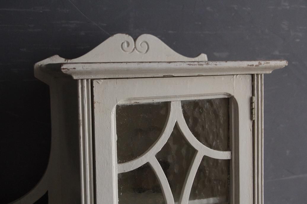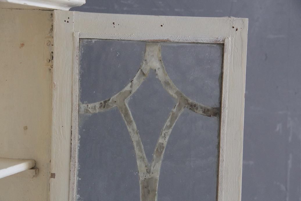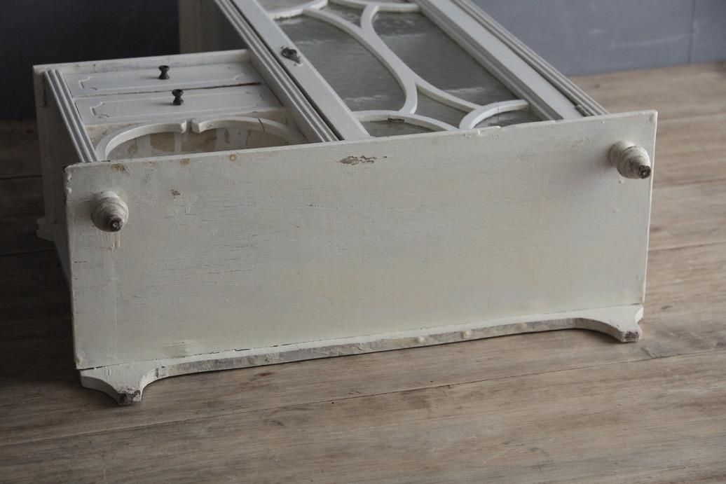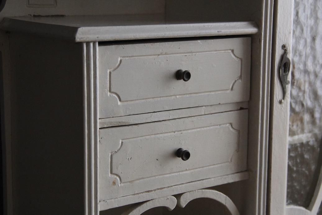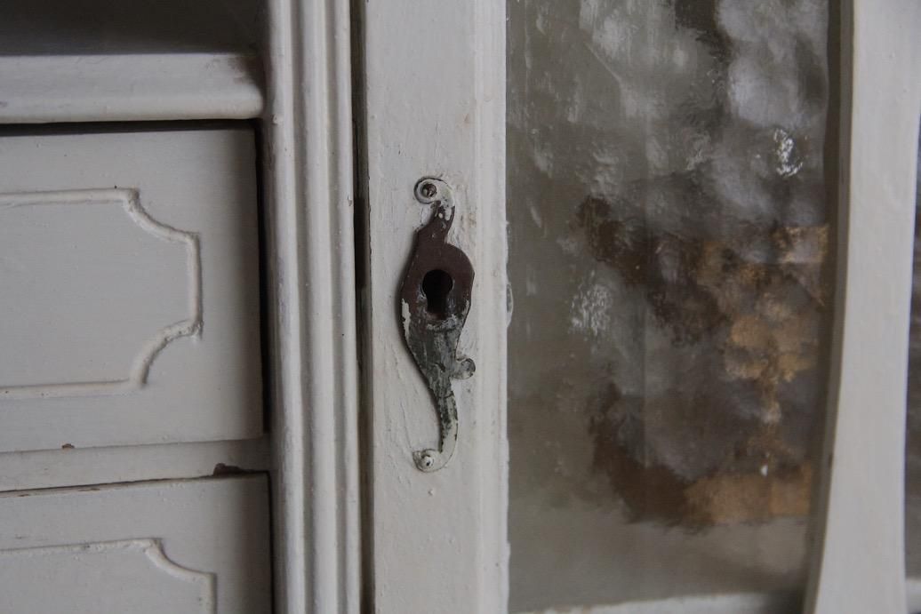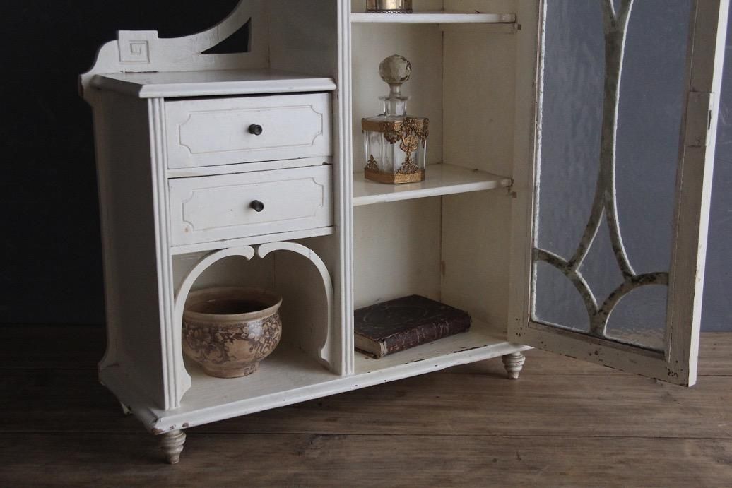 随所に施された装飾や鍵穴、引き出しの取っ手の金具が可愛らしいです。凹凸のあるガラスも表情が豊かでアクセントになっています。