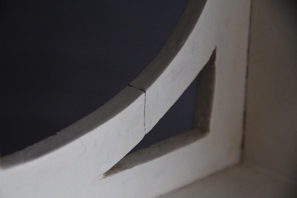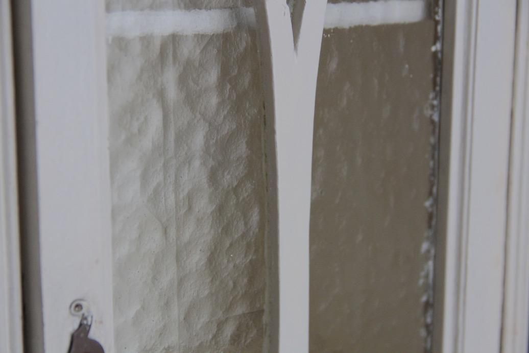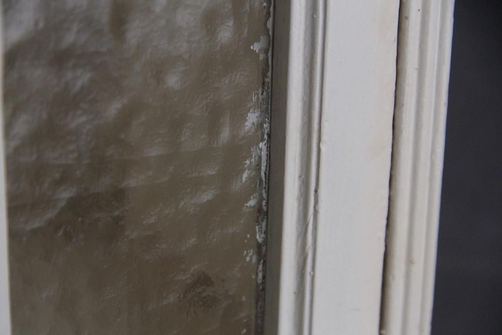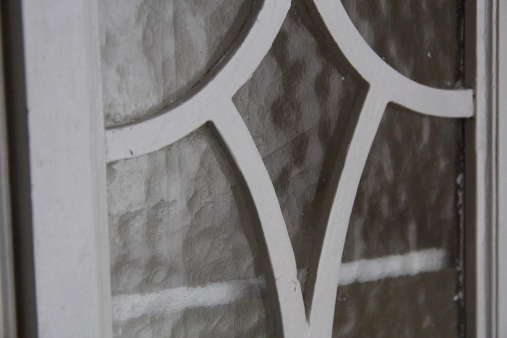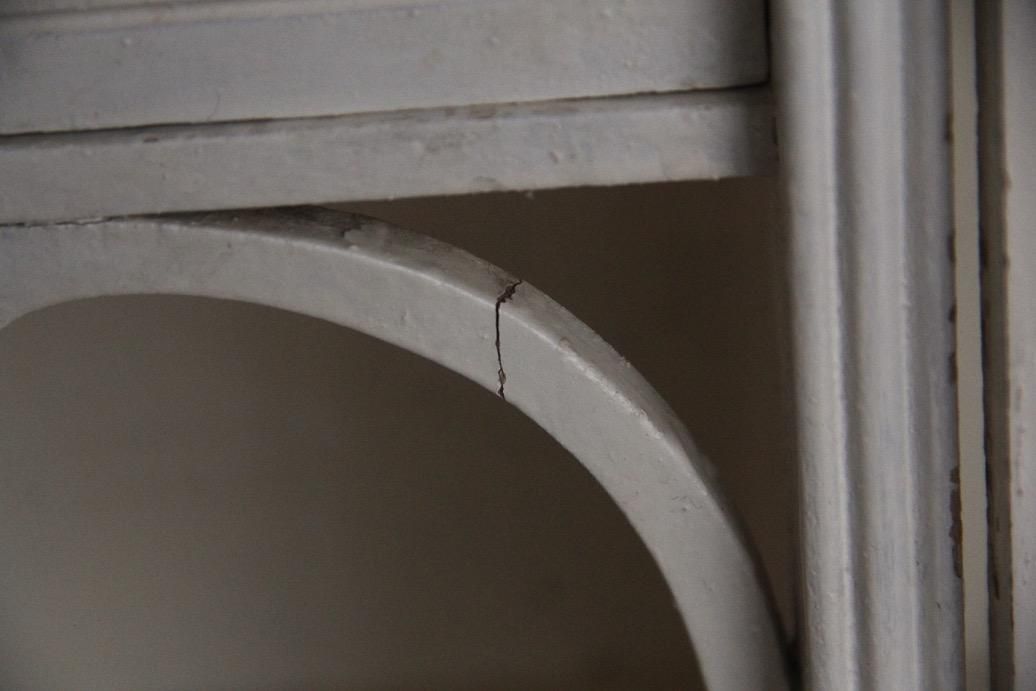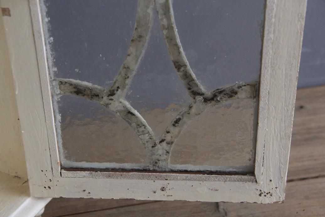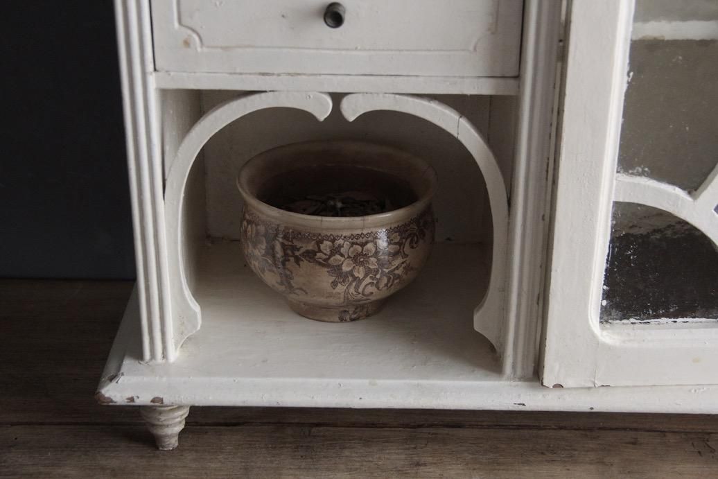 随所に施された装飾や鍵穴、引き出しの取っ手の金具が可愛らしいです。凹凸のあるガラスも表情が豊かでアクセントになっています。