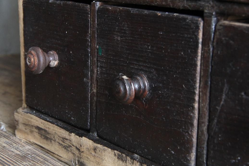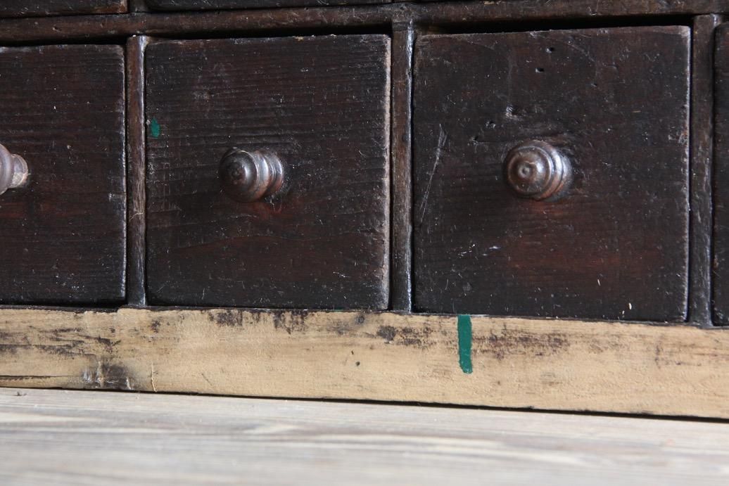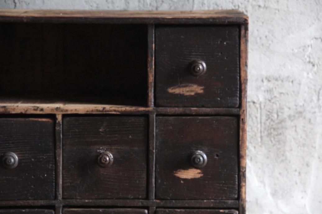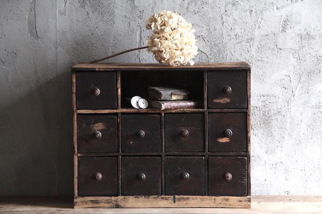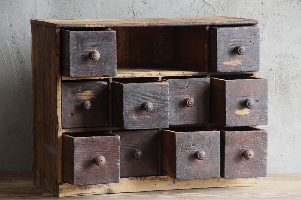 程よいサイズ感の本体、10個ある引き出しには様々な金具が打ち付けられていて一つひとつに個性があります