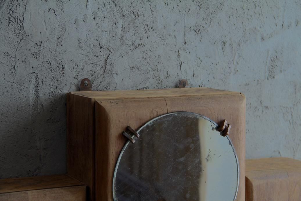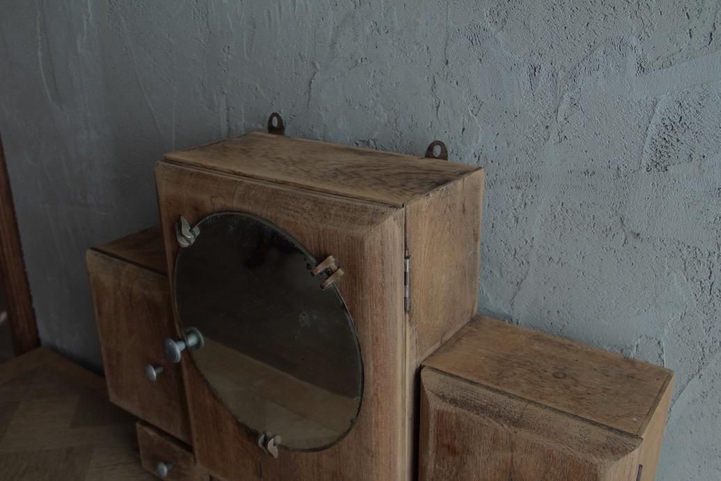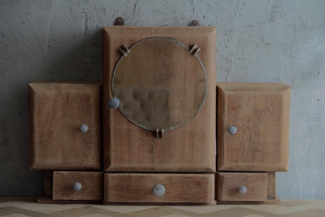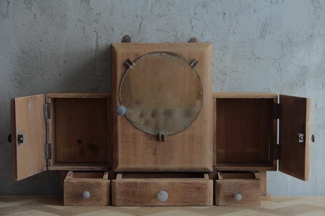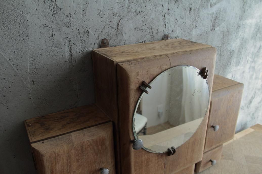 中央には丸い古鏡があしらわれ、左右に小さな扉収納、下部には引き出しが並ぶ、実用性と装飾性を兼ね備えたデザイン