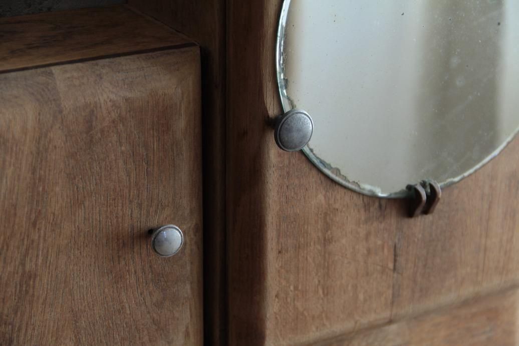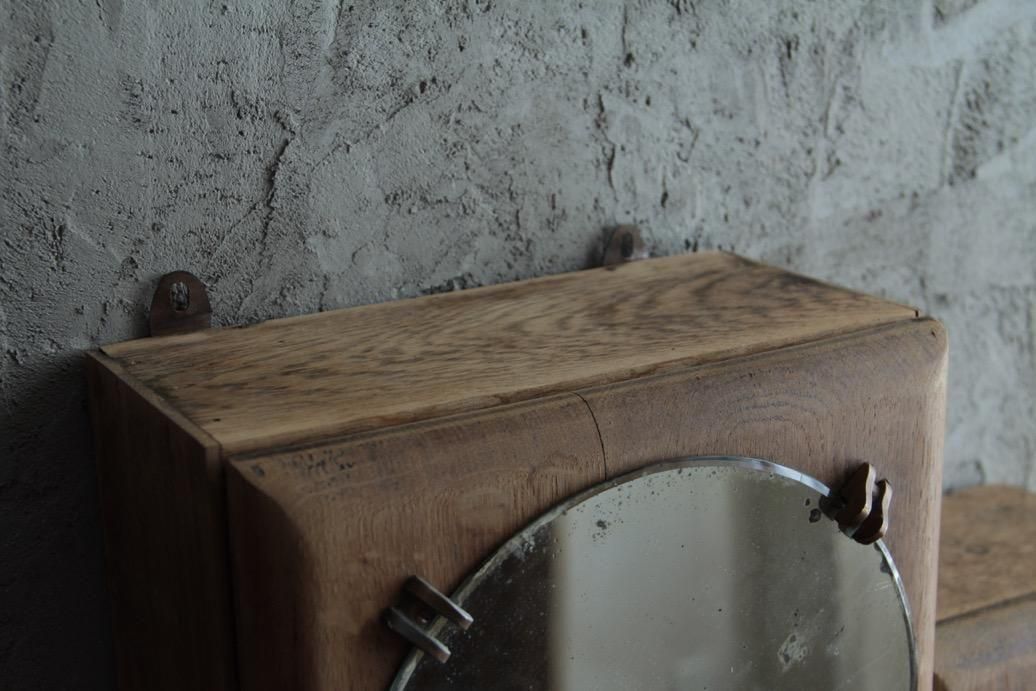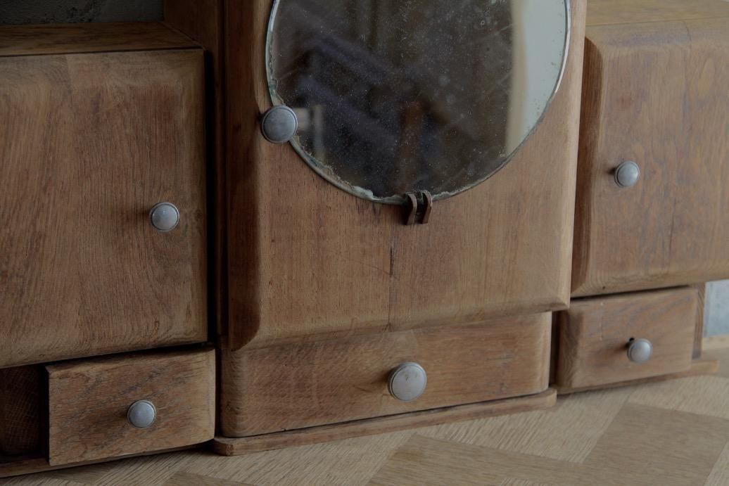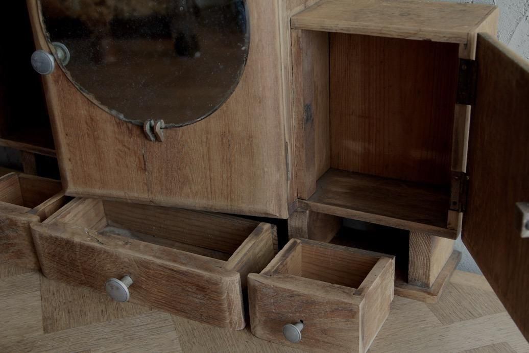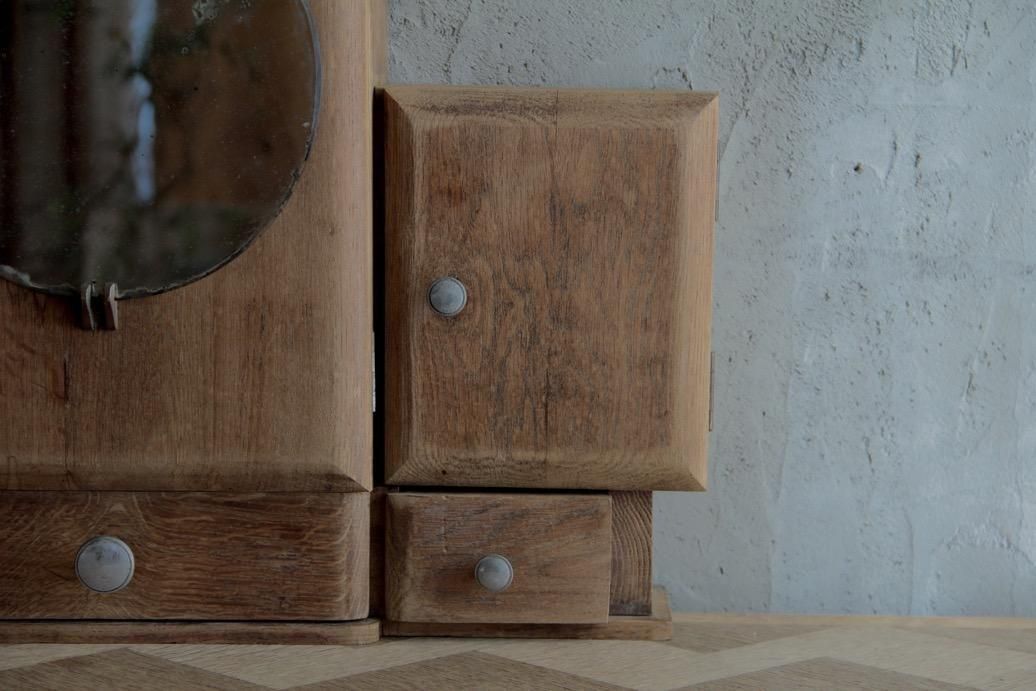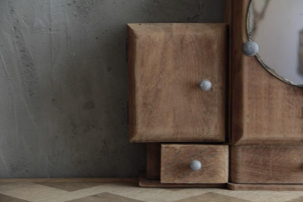 中央には丸い古鏡があしらわれ、左右に小さな扉収納、下部には引き出しが並ぶ、実用性と装飾性を兼ね備えたデザイン
