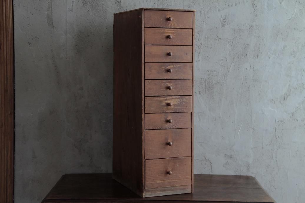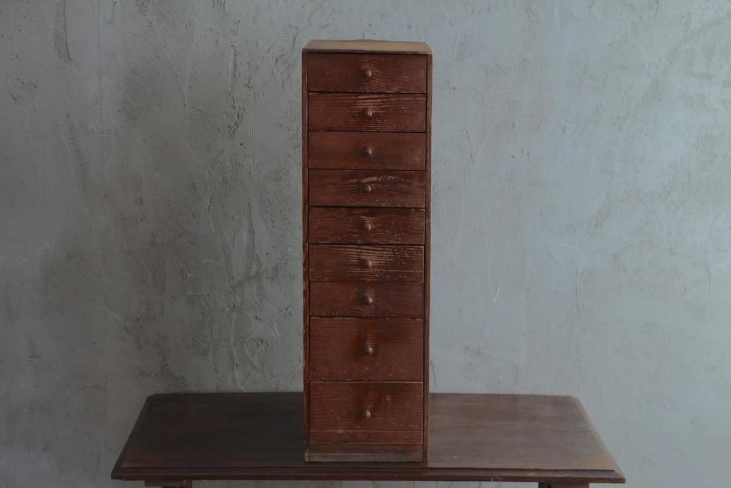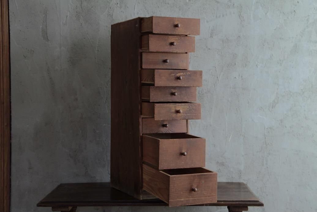 9つの細かな引き出しを備え、紙類や文具、裁縫道具、アクセサリーなど、こまごまとしたアイテムの整理に最適な一台