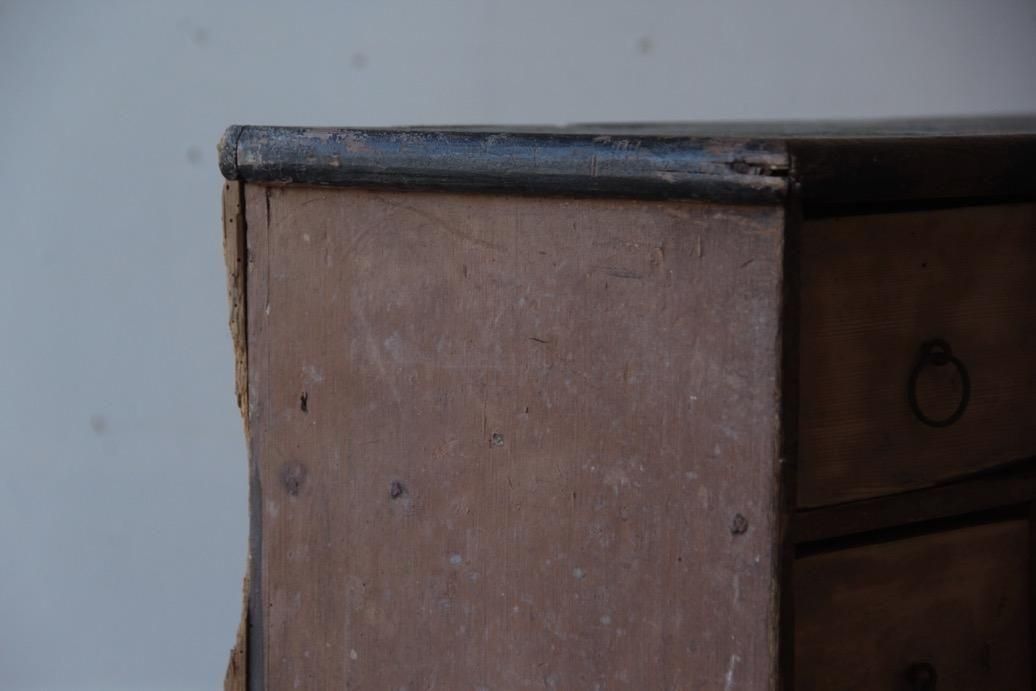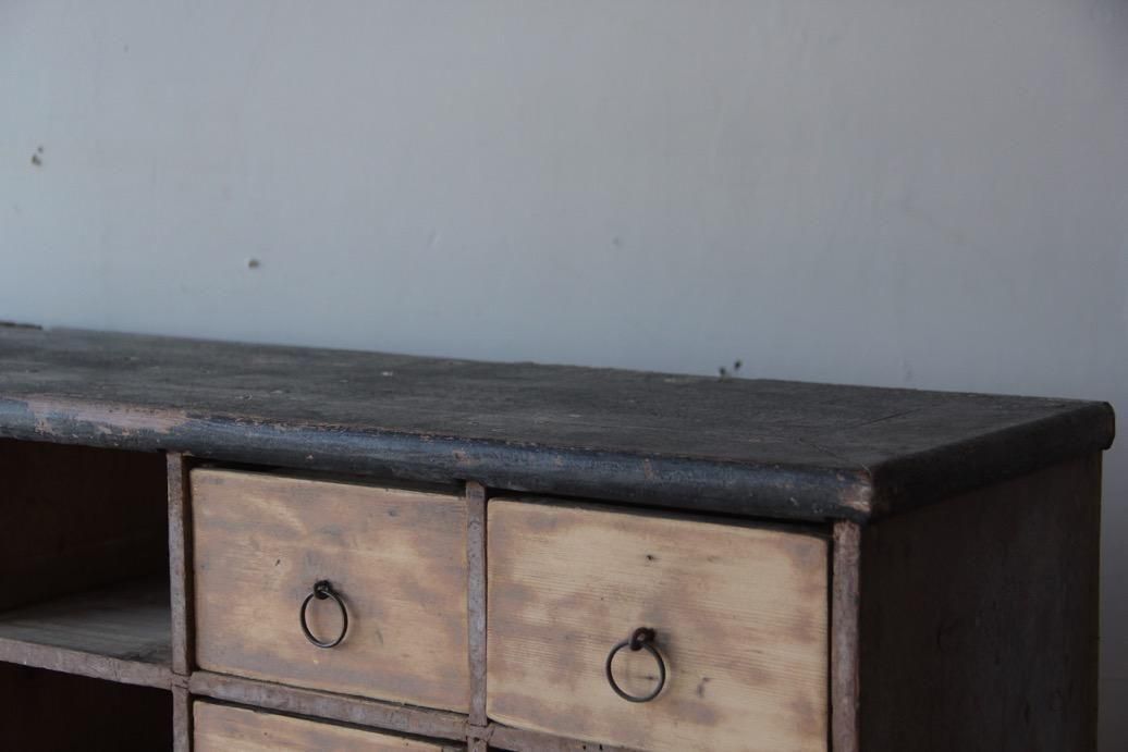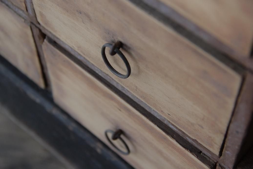 古びた鉄製の金具が付いた引き出しと天板、土台とのコントラストが絶妙な雰囲気です