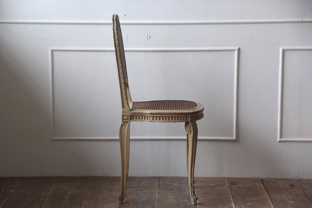 背もたれから座面にかけて施されたケーンワークは、美しい透け感と軽やかな印象を与え、空間に優雅なリズムを添えます
